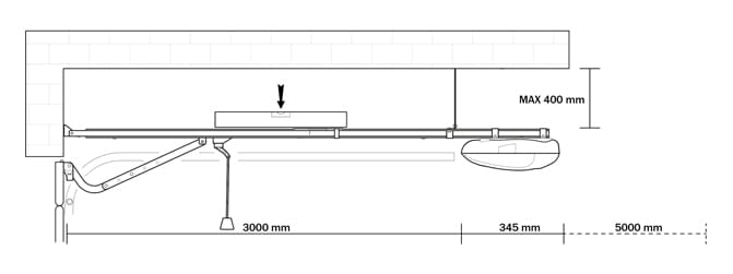 Zestaw z napędem z silnikiem 24V DC 1000 N do segmentowych bram garażowych, 2-częsciową prowadnicą i paskiem transmisyjnym (2 x 1650 mm).